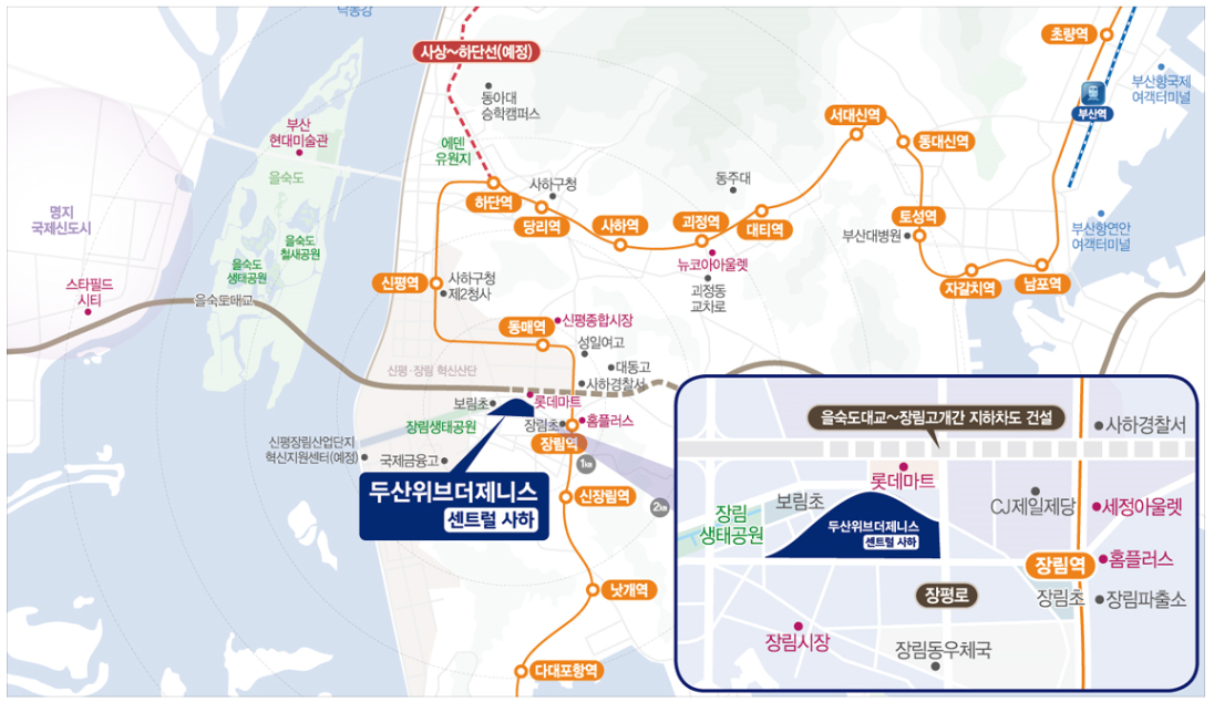 두산위브더제니스는 도보이용 가능한 지하철 1호설 장림역과 동매역을 품은 역세권 대단지이며 을숙도대로, 장평로, 남해제2고속도로, 중앙고속도로 등 광역교통망을 가지고 있습니다.
